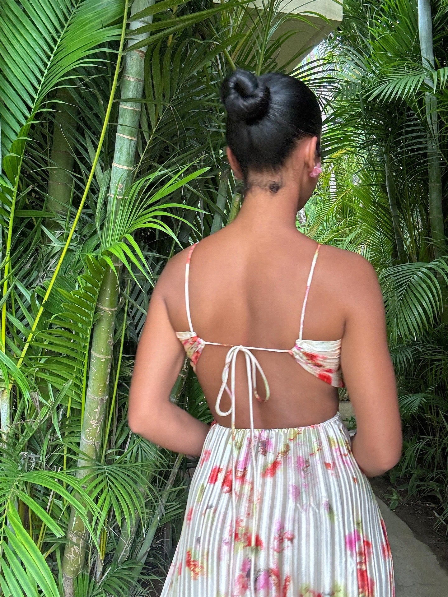 Get ready to turn heads with our Tropical Maxi Dress! The soft flow pleated design features vibrant flowers and colors that will make you shine just as bright. Perfect for weddings or vacations, this elegant dress will have you looking and feeling gorgeous. Don't miss out on this must-have piece!